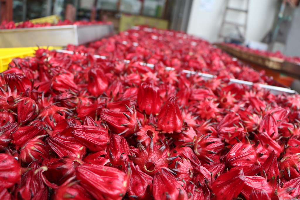 新鮮洛神花除了做成蜜餞外還可以烘焙成洛神花乾,洛神花以龍眼木材慢火煙燻3至4天碳焙而成,比重更是達到10:1的,而以機器烘焙的味道遠不如龍眼木材煙燻而成的香,洛神花乾可以泡成洛神花茶,如果加入水果那風味更佳...